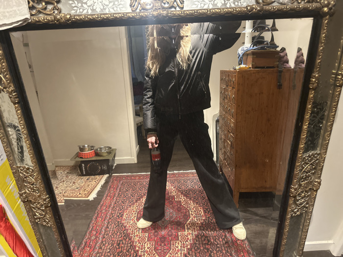 The image presents a full-body reflection of an individual standing in an ornate mirror, set within an indoor environment in the city of Paris, France. The person has long, light-colored hair and is wearing a black padded jacket, black wide-leg trousers, and white sneakers. They hold a red bottle, consistent with a Coca-Cola product, in their right hand. The mirror itself has a substantial, decorative frame in gold and black, featuring intricate scrollwork and a patterned border along the top. The reflected room contains a dark wooden floor, largely covered by a prominent red and beige Persian-style rug with complex patterns. To the left of the reflected individual, two metallic pet bowls rest on a red stand, which in turn sits atop a dark, square object on the floor. A light-colored wall and a white door frame are visible further in the background. To the right of the individual, a tall, antique-style wooden chest of drawers with numerous small compartments is present. Various items are placed on its top surface, including a blue and white patterned ceramic object, a small wooden box, and some fabric materials. The scene is illuminated by interior lighting.