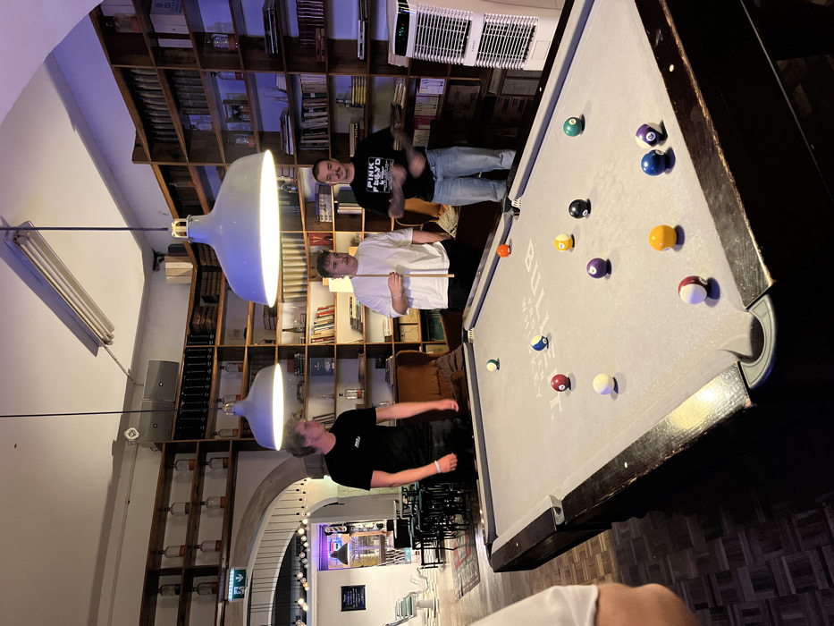 This image depicts an indoor recreational area within an establishment in Lisbon, Portugal, exhibiting a library-lounge aesthetic