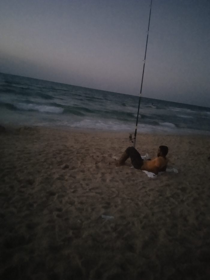The image depicts a solitary figure on a sandy beach in Al-Mawasi, Palestinian Territories, during twilight or nighttime conditions. A single male individual is observed in the mid-ground, reclining on the sand, supported by his elbows with his knees bent. He is wearing a light-colored, short-sleeved shirt and dark pants, and is barefoot. A white cloth or towel is positioned beneath him. Directly in front of the individual, closer to the water's edge, a tall fishing rod is planted vertically in the sand, with its line extending into the ocean. The sea exhibits moderate waves, breaking onto the shore, with visible foam. The sky is dark grey, indicative of low light. Scattered light-colored debris is present on the sand in the foreground.