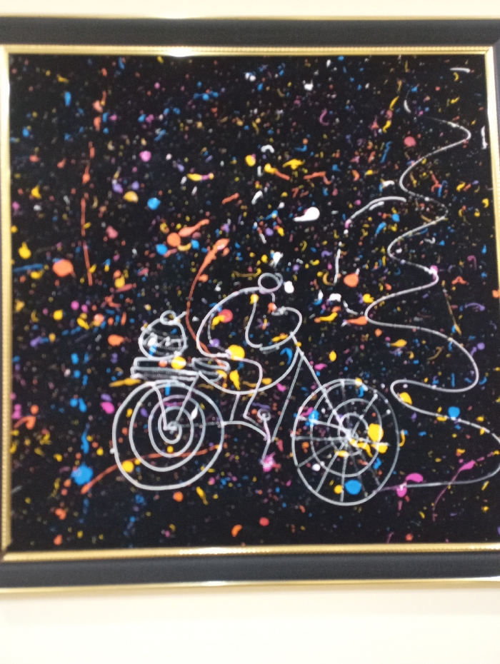 The image displays a framed piece of artwork, photographed indoors in Gwarinpa, Nigeria. The artwork features a predominantly black background uniformly speckled with numerous, randomly distributed paint splatters in various colors including pink, blue, orange, yellow, purple, and white. Centered on this abstract background is a minimalist line drawing, executed in white, depicting a stylized bipedal character riding a two-wheeled bicycle. The character has a simple, rounded head and body, and a smaller, rounded companion figure is positioned on the bicycle's handlebars. The bicycle itself is outlined with distinct wheels, spokes, a frame, and handlebars. A wavy white line trails from the rear of the bicycle, suggesting motion. The artwork is enclosed by a rectangular frame composed of an inner gold-colored, textured border and a wider, plain black outer section. Slight surface reflections are visible on the artwork, indicating a protective layer. The immediate background surrounding the frame is a plain, light-colored surface.