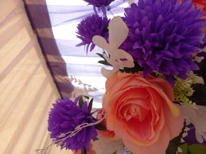 The image displays an upward-angled view of an artificial floral arrangement, captured within a setting in Ohafia, Nigeria. The foreground is dominated by a cluster of artificial flowers, primarily featuring several vibrant purple chrysanthemum-like blooms and a prominent, large peach-colored artificial rose. White artificial twig-like elements and smaller green and white artificial foliage are interspersed throughout the arrangement. In the upper background, a light-colored, possibly beige or cream-colored, fabric canopy or tent ceiling is visible, showing linear folds or seams. Below this canopy and behind the flowers, bright light filters through sheer purple curtains, which appear to cover a window or opening, creating a softly illuminated backdrop. No individuals or actions are depicted in the scene.