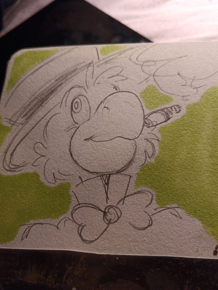 The image is a pencil drawing on a sheet of white paper with a yellow-green wash. The drawing is of a cartoon figure wearing a hat and a bow tie and holding a cigarette. The figure is drawn in a simple style, with a large head and small body. The figure's eyes are large and round, and it is smiling. The figure is depicted from the chest up and is facing the right. The figure's hat is a fedora with a brim that is slightly tilted to the right. The figure's bow tie is a classic shape, and it is tied tightly. The figure is holding the cigarette with its right hand, and the cigarette is pointing towards the right. The background of the drawing is a solid yellow-green color. The coordinates 50.464, 3.011 correspond to a location in the town of Oignies, France. The image is likely a drawing that was done in Oignies, France.
