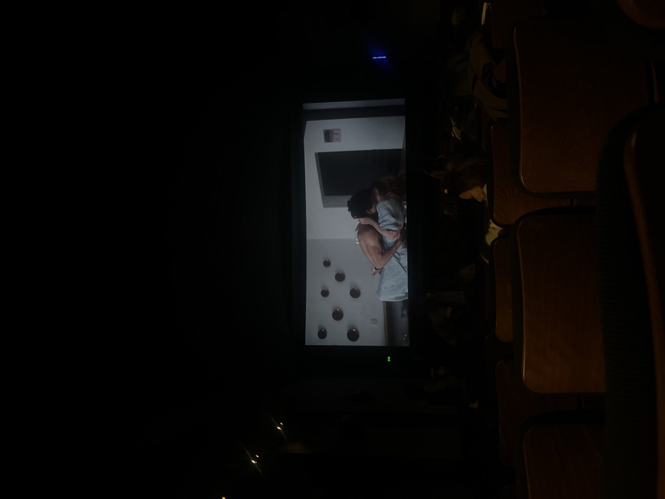 A dark room with a screen showing a scene of a man and woman embracing. The scene appears to be from a movie or television show, set in a modern, minimalist room. The right side of the image shows a row of empty wooden seats, suggesting the room is a cinema or theater. The overall tone is dimly lit, focusing attention on the illuminated screen.