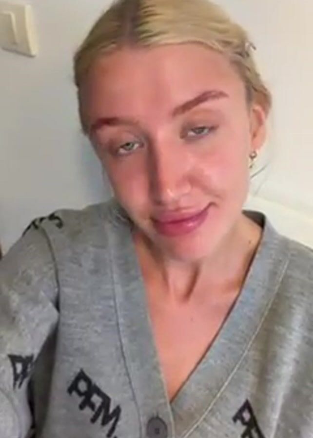 Here's a detailed description of the video: The video shows a fair-skinned woman with blonde hair pulled back and blue eyes. She is wearing a gray cardigan with the letters "PFM" repeated in black. She is smiling and winking at the camera. Her lips are plump, and she has small, gold hoop earrings. The background is a plain white wall with a light switch visible in the upper left corner. The lighting is bright.