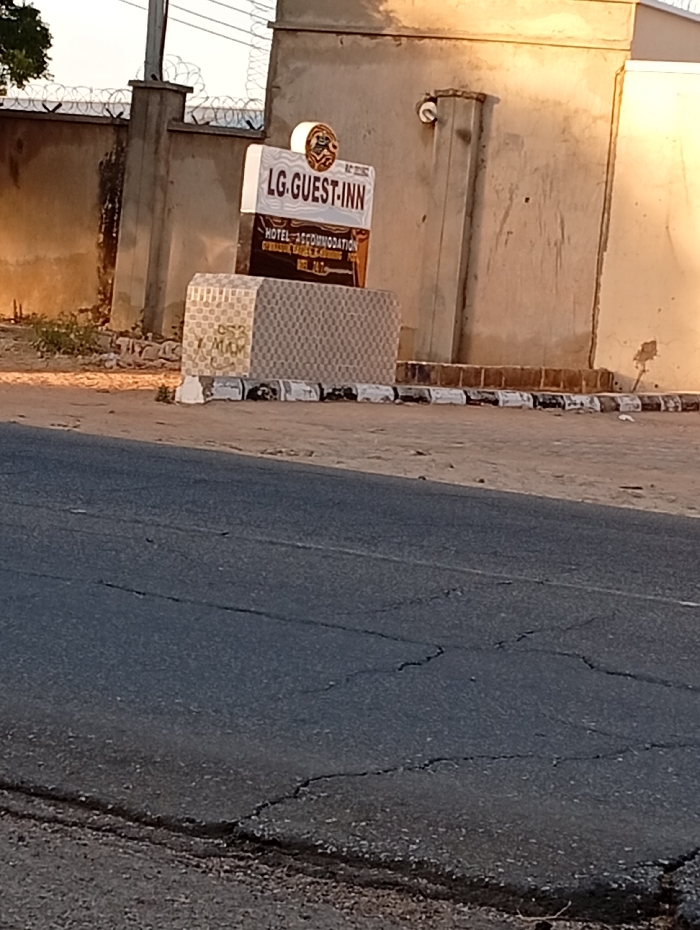 The image features a sign for "LG. GUEST-INN" situated beside a road. The sign, mounted on a checkered block, advertises hotel accommodation, and other services. Behind the sign stands a weathered wall with an exterior pipe or conduit visible. The road shows signs of wear and tear with cracks in the asphalt.
