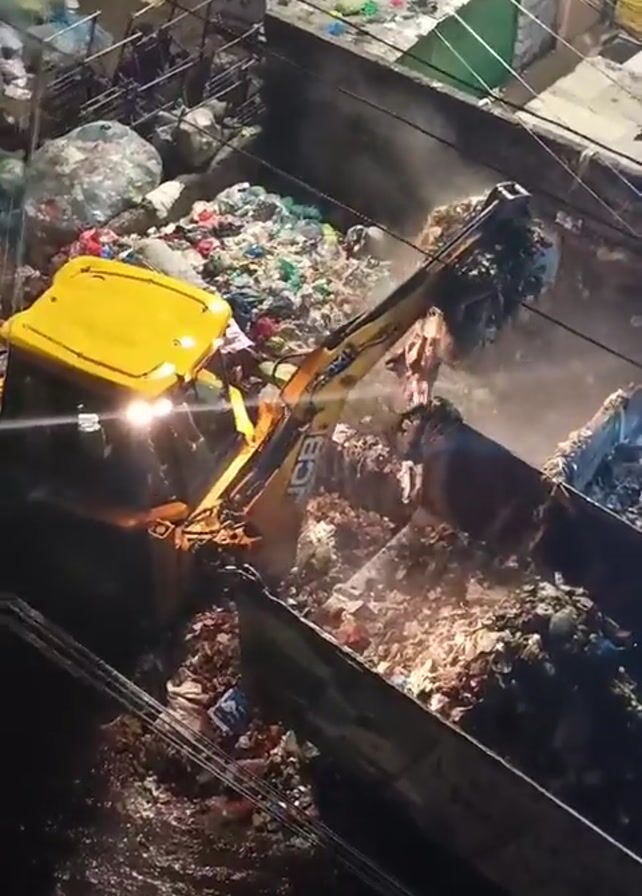 From an elevated vantage point, the video captures a yellow JCB excavator in action at night. The excavator, equipped with headlights, is situated on the edge of a waterlogged area, its bucket scooping up a massive pile of garbage. The garbage consists of mixed waste including plastic bags, bottles, and various unidentified debris. The excavator then deposits its load into a large, dark-colored open-top container. Steam rises from the garbage pile and in the background, a street is visible with buildings, some of which have closed metal shutters, and overhead power lines. The scene conveys an effort to clear a significant amount of garbage from a public space.
