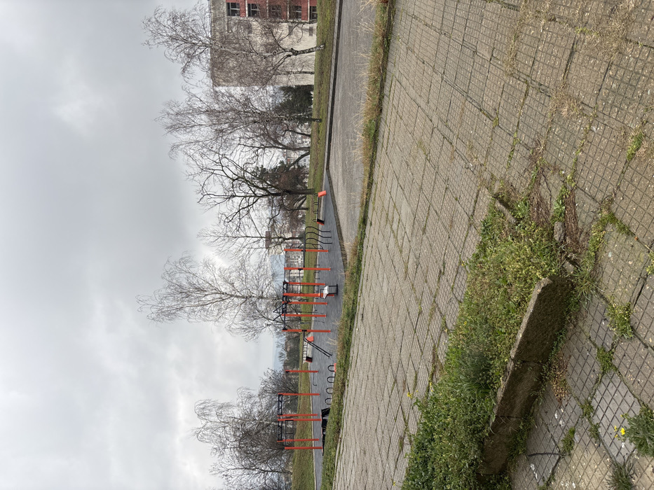 This image depicts an empty outdoor calisthenics park in the city of Veliko Tarnovo, Bulgaria, under an overcast sky