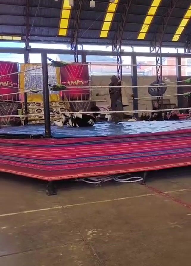 wrestling match in a wrestling ring set up inside of a large indoor area