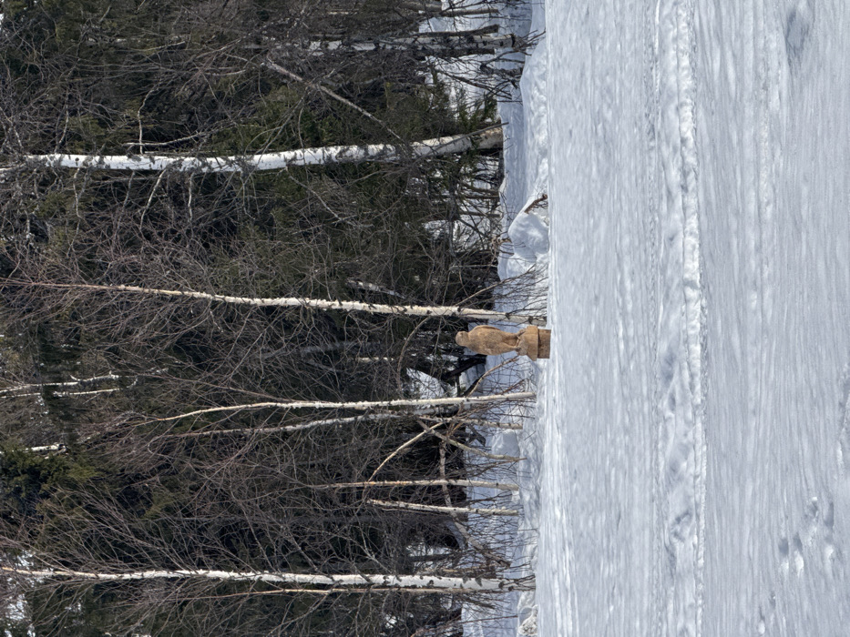 The image depicts a winter outdoor scene in Shumikhinskii, Russia. The foreground is an expanse of undisturbed snow, marked by visible tire tracks and faint human footprints. In the mid-ground, a light-colored wooden carving of a bird, resembling an eagle or hawk, stands prominently on a dark, cylindrical wooden pedestal. The bird carving is positioned facing slightly towards the left. Immediately behind the carving, a sparse line of multiple birch trees with distinct white bark and bare branches rises from the snow. Further behind the birch trees, the background transitions into a dense forest comprising both bare deciduous trees and dark evergreen conifers. Patches of snow are present among the trees and along the treeline. The scene is illuminated by daylight. No human figures are present, and no actions or interactions are occurring.