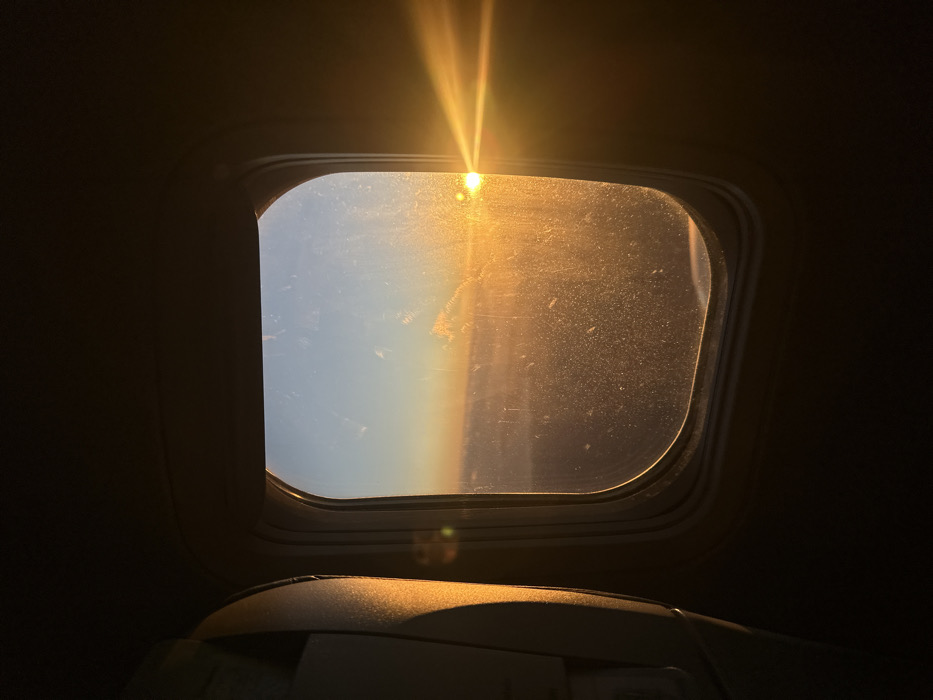 Looking out an airplane window, a bright sunbeam pierces through, partially obscured by a layer of dust on the pane