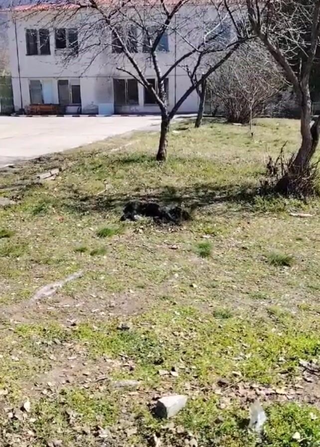 black dog lying on the grass in the shade of a tree. The grass is patchy with bare dirt and scattered leaves. In the background is a white building with windows and doors. There is a paved area next to the building. A couple of other trees are also visible. The sun is shining, casting shadows on the ground.