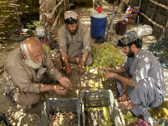 - "Three men are observed engaging in grape processing activities under a shaded structure in Bazar-e Panjva'i, Afghanistan" by FM-B5wmg2, licensed under CC BY 4.0