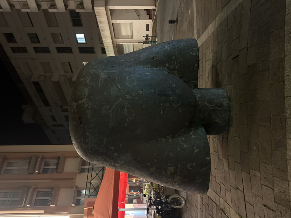 This nighttime image depicts an outdoor public square, identified as Place Georges Clemenceau in Biarritz, France. A large, dark, weathered bronze sculpture, known as "La Tête" by Igor Mitoraj, occupies the central foreground. It is an abstract, stylized representation of a human head or bust, resting on a thick cylindrical base on a paved surface composed of rectangular stone pavers. Subtle, eroded facial features are discernible on its surface. To the immediate left, a multi-story building with a light-toned facade and multiple windows features a brightly lit red awning extending over a ground-floor area. Several bicycles, including one electric bicycle with prominent white-walled tires, are parked near this establishment. In the background to the right, a darker, multi-story building, likely residential, exhibits multiple balconies and one brightly lit upper-floor window. Below it, a smaller, lighter-colored structure with an exterior staircase is visible. The scene is illuminated by ambient artificial light from surrounding structures and streetlights, casting defined shadows to the right of the central sculpture. No human figures are present.