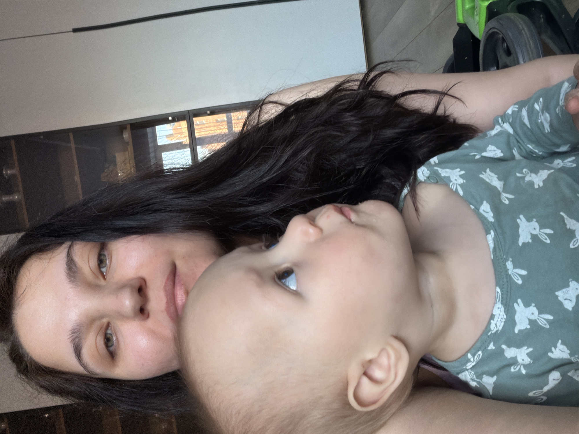 The image depicts an indoor scene in Chaikovsky, Russia, featuring an adult female holding an infant. The adult, positioned in the upper portion of the frame, has dark, long hair and light-colored eyes, looking directly at the camera with a neutral expression. She appears to be wearing a light-colored top, with a strap visible on her left shoulder. The infant, held in front of the adult, occupies the lower part of the frame. The infant has light skin, blue eyes, and light-colored hair, looking upwards and to the right, away from the camera. The infant is dressed in a green top patterned with white rabbits. The background includes a dark-colored cabinet with glass doors and shelves on the left, a white wall on the right, and a window reflecting a building with reddish-brown elements and bare tree branches. The flooring visible at the bottom right is light-colored wood or laminate, next to which a black wheel and a partial green plastic object, possibly a toy, are visible.