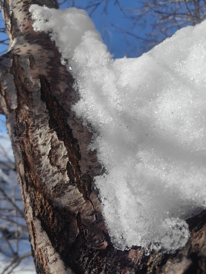 The image displays a close-up, upward-angled view of a tree in Volgograd, Russia, indicative of a winter or early spring setting. The central subject is a section of a deciduous tree trunk, characterized by rough, vertically fissured bark in brown and reddish-brown tones. A significant accumulation of white, granular snow rests on a horizontal plane of the tree's structure, spanning from the left mid-frame to the upper right. The snow's surface exhibits sparkling reflections consistent with direct sunlight. Along the interface where the snow meets the bark, multiple glistening water droplets or small ice formations are visible, indicating active melting. The background features a clear, vivid blue sky. Blurred, denuded tree branches are partially discernible against the sky and in the distant background on the left, confirming a cold-weather, sunny environment. No human presence or specific actions beyond natural processes are observed.