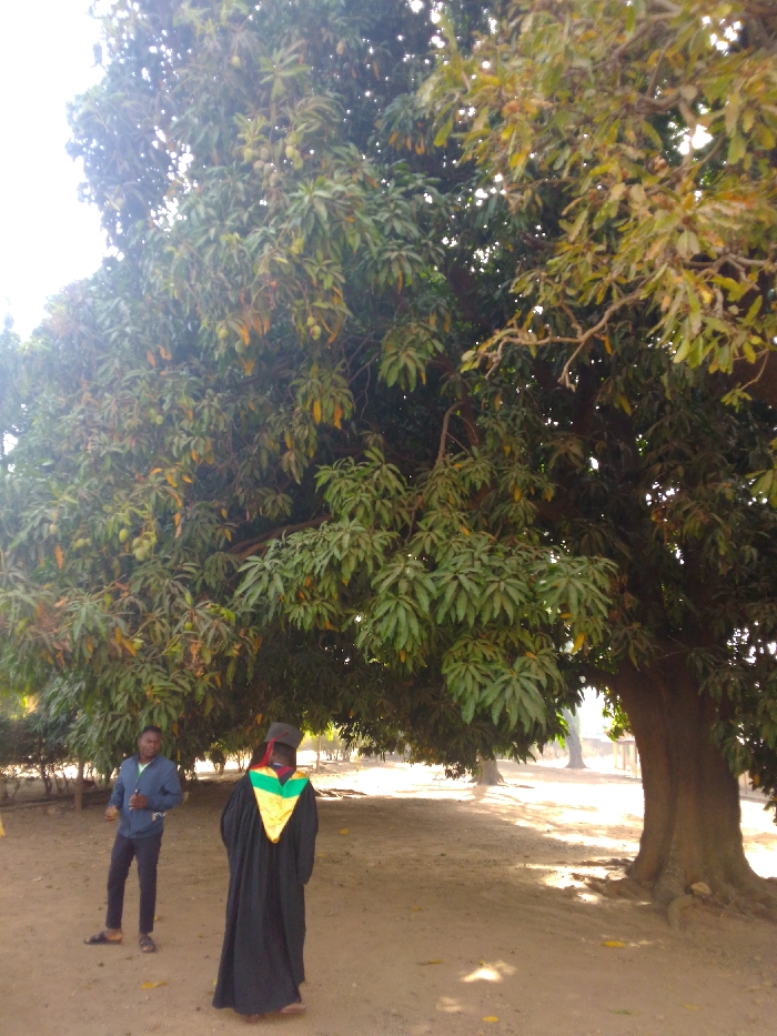 This outdoor scene in Saminaka, Nigeria, features two individuals positioned on light brown earth beneath the extensive canopy of mature mango trees. Numerous unripe mango fruits are visible among the dense green foliage overhead. In the foreground, a person is observed from behind, wearing a black academic gown, a yellow and green academic hood, and a black cap, moving towards the right side of the frame. To the left, a second male individual stands, facing partially left, dressed in a light blue long-sleeved shirt and dark trousers, holding a small, dark object in his right hand. The environment is brightly illuminated by natural daylight, casting shadows beneath the trees.