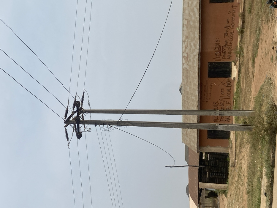 The scene depicts an outdoor environment in Moniya, Nigeria, under a light grey, hazy sky. Centrally positioned are two parallel concrete utility poles supporting electrical infrastructure. This includes multiple insulators, a crossarm, and a complex array of overhead power lines extending horizontally across the frame and diagonally towards the upper right. Several loose, bundled wires are visible along the poles. Behind the utility poles, a single-story structure with light brown or terracotta-colored walls and a corrugated metal roof is present. The building's front façade displays handwritten black inscriptions, notably "1/12/2018 Ps Bode JII ors v AKINYELE LOCAL GOV" repeated twice on different sections of the wall. Dark, recessed rectangular shapes indicate potential windows or doorways. To the left of the main structure, parts of additional buildings with corrugated roofs and a dark wooden gate are visible, along with a thin wooden pole. The foreground and mid-ground consist of unpaved, reddish-brown dirt interspersed with sparse, dry vegetation. A concrete curb is partially visible in the lower-left corner of the image. No individuals or active movements are observed.