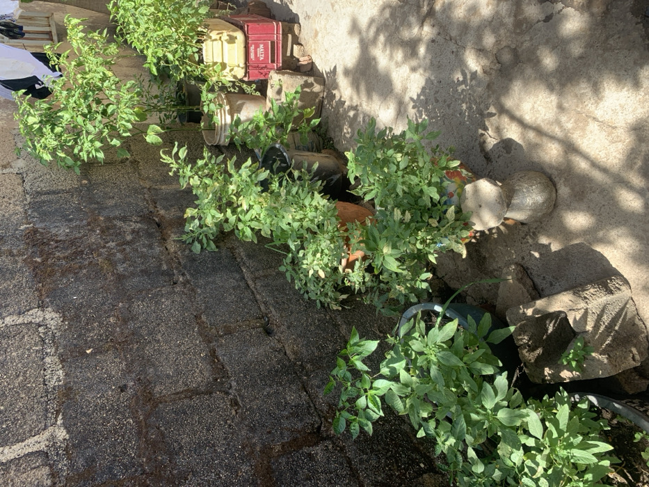 This image, captured in Jos, Nigeria, presents an outdoor scene featuring an array of container plants situated along a weathered concrete block wall