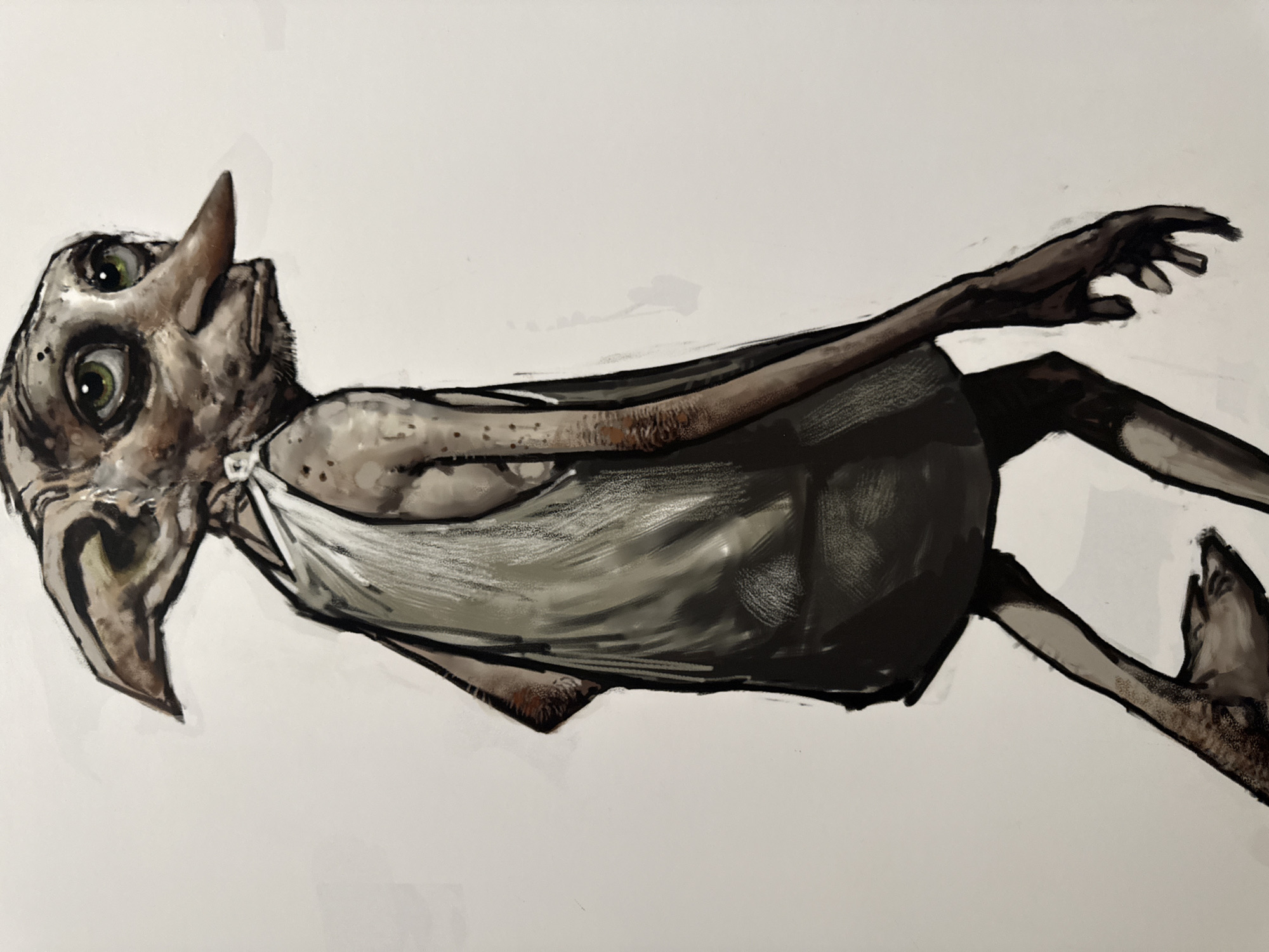 A digitally painted illustration depicts a house-elf, specifically Dobby, standing in a full-body, three-quarter profile facing right, with its head turned slightly left