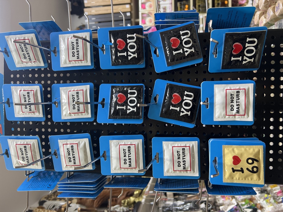 The image displays a close-up view of a retail merchandise display rack, likely situated within a novelty or souvenir shop in Bansko, Bulgaria. The central object is a black, perforated pegboard-style display unit. Attached to this unit via individual metal hooks are numerous individually packaged novelty condoms. There are three distinct designs visible on the condom packages: 1. **"DO NOT MASTURB"**: These packages feature a white foil wrapper with a prominent red rectangular border containing the black capitalized text "DO NOT MASTURB". Multiple units of this design are present. 2. **"I ❤ YOU"**: These packages feature a black foil wrapper with a red heart symbol followed by the white capitalized text "YOU". Several units of this design are displayed. 3. **"I ❤ 69"**: A single package of this design is visible in the lower left section, featuring a gold foil wrapper with a red heart symbol followed by the black numerical text "69". All visible packages are affixed to blue rectangular cardboard hang tags. The items are arranged in rows and columns, although some packages hang slightly askew. The background, out of focus, shows blurred elements of additional retail merchandise, including what appears to be animal print fabric or items to the far left, and various other packaged goods or display shelves to the right. No individuals, specific actions, or interactions are visible in the frame. The lighting suggests an indoor, artificially lit retail environment.