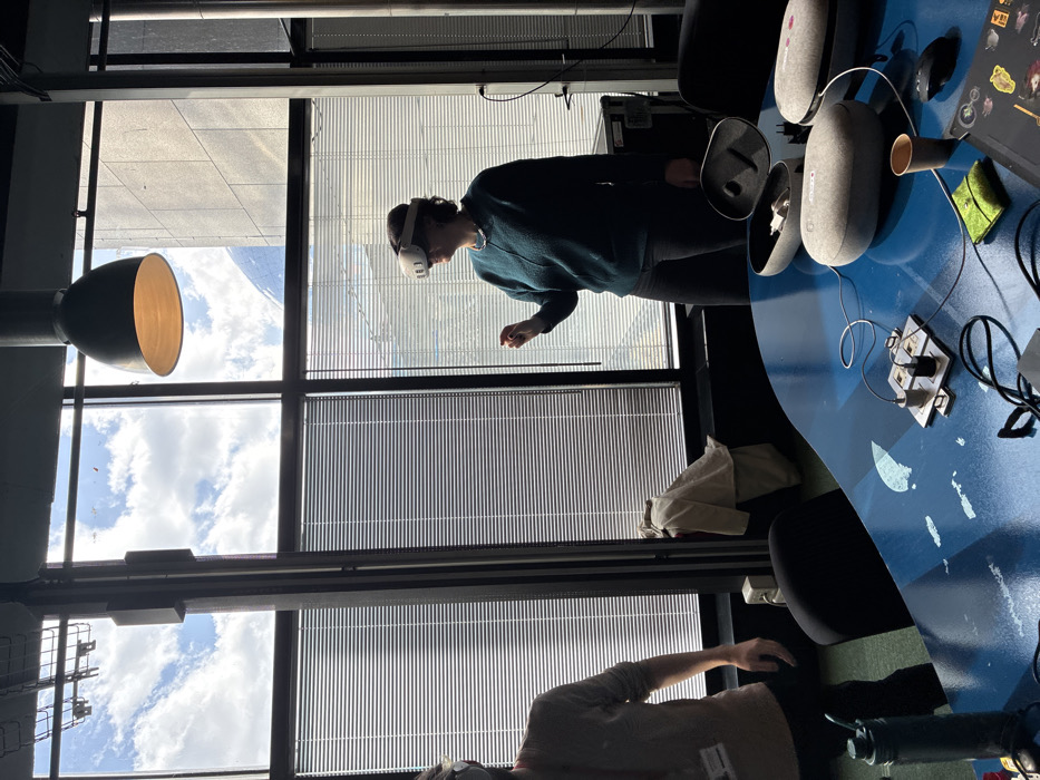 The image depicts an indoor scene within a modern architectural building, likely an office or exhibition space, located within the Parc de la Villette, Paris, France, with a prominent view of the Géode dome through large windows. Two individuals are present. On the right, a female subject with dark hair, wearing a dark green sweater and dark pants, stands upright. She is actively wearing a white virtual reality (VR) headset, possibly an Apple Vision Pro, and has her right hand raised with fingers slightly separated, indicating interaction with virtual content. To her left, a male subject is partially visible from the chest down, wearing a light brown long-sleeved shirt with an ID badge clipped on, and dark pants. He holds a dark green water bottle in his left hand and appears to be standing near the window. A second VR headset is partially visible on his head. The foreground is dominated by a blue, irregularly shaped table. On the table, a black open case for a VR headset contains white accessories. Two white, oval-shaped devices, resembling VR headset battery packs or cases, are present; one is open, revealing contents, while the other is closed. Both are connected by cables to a silver square power strip that holds three black power adapters. A black computer mouse, a brown disposable cup, a small green textured pouch, and a partially visible laptop displaying graphics are also on the table. Black office chairs are tucked beneath the table. The room features a large window wall with horizontal blinds partially drawn. Through the upper sections of the windows, a blue sky with white clouds is visible, along with the distinctive reflective silver geodesic dome of the Géode and the concrete facade of an adjacent building. Inside, a dark industrial-style pendant light hangs from the ceiling. A light-colored garment is draped over an unseen object or chair near the window between the two individuals. A large black equipment case is visible behind the female subject to the right. The floor is covered with a green carpet.