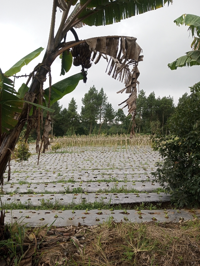 The scene depicts an agricultural field in Kondha, India, under an overcast sky. In the left foreground, a banana tree (Musa species) stands with green and dried, tattered leaves, featuring a cluster of dark, unripe bananas hanging from its stalk. The ground in the immediate foreground consists of dry grass and leaf litter. To the right foreground, a dense, dark green shrub is partially visible. The midground is dominated by a large cultivated area organized into parallel rows of raised beds covered with light-colored, possibly grey or white, plastic mulch. Numerous small, green plant seedlings are visible emerging through evenly spaced perforations in the mulch. Narrow strips of dry grass separate these mulched rows. Towards the middle-background of the field, a section contains multiple upright wooden stakes or poles arranged in rows, suggesting a trellis or support structure for crops. The background features a dense treeline composed of tall, coniferous trees. The sky is uniformly grey and cloudy. No individuals or animals are present.