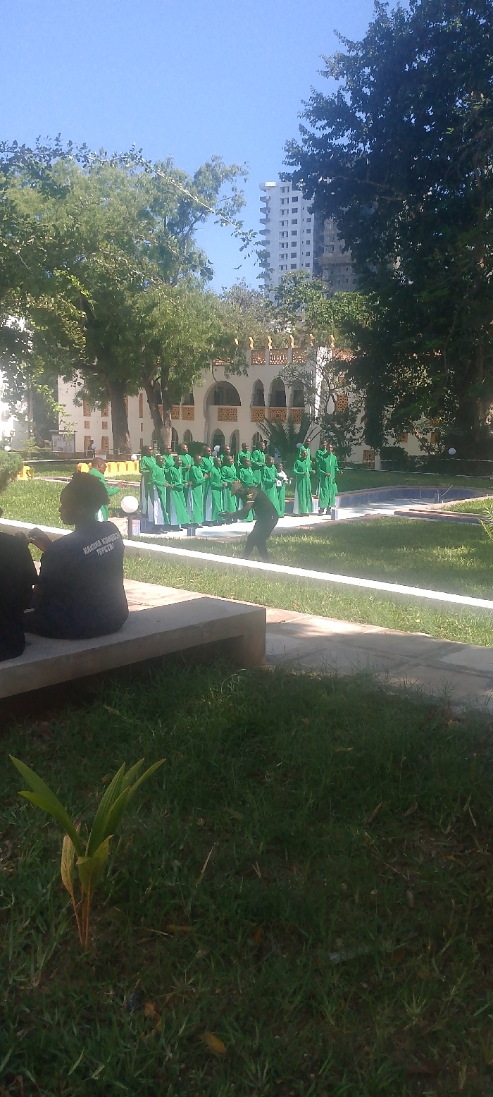The image displays an outdoor scene in Tudor ward, Kenya, under a clear blue sky. In the lower-left foreground, two individuals are seated on a concrete bench; one wears a dark t-shirt with the white text "HABARI KIUMBANI PEPETA" on the back. A paved pathway separates this area from a manicured green lawn. In the midground, a group of approximately 25-30 individuals, primarily young adults, stands in organized rows on the grass. They are uniformly dressed in long, flowing green robes over white undergarments. One individual in dark attire, possibly with yellow accents, actively gestures or moves in front of this group, leaning forward with arms outstretched. To the right of the group, a blue-tiled water feature is visible. In the background, a multi-story cream-colored building with distinctive arched windows and decorative golden-brown architectural details is partially visible through green trees. Above and behind this structure, a tall, modern, light-colored high-rise building is visible against the clear sky. The overall environment features lush green grass and numerous trees.