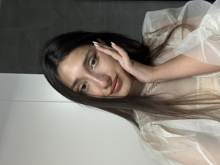 A female individual is depicted in a close-up, upper-body shot, positioned in Budva, Montenegro. She has long, dark brown hair, parted centrally and falling over her shoulders. Her left hand is raised to her face, fingers splayed and resting against her cheek and temple. Her nails are manicured with white polish in an almond shape. She wears a sheer, light beige or off-white top with puffed sleeves, under which a solid beige or cream-colored garment is visible. A chunky gold-colored chain necklace adorns her neck. Her makeup includes winged eyeliner and glossy, light brown or nude lipstick. She is looking directly towards the viewer with a slight smile and her head tilted slightly. The background consists of a flat white surface on the left and a dark gray or black textured surface on the right, indicating an indoor setting.