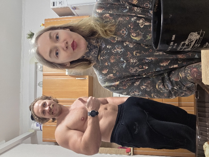 A man and woman pose together in a kitchen. The man is shirtless, wearing dark sweatpants and a watch. He is giving a thumbs up. The woman wears a patterned, long-sleeved shirt and has red lipstick. Kitchen cabinets are behind them. A black mug is partially visible in the upper right corner. The photo is slightly tilted.