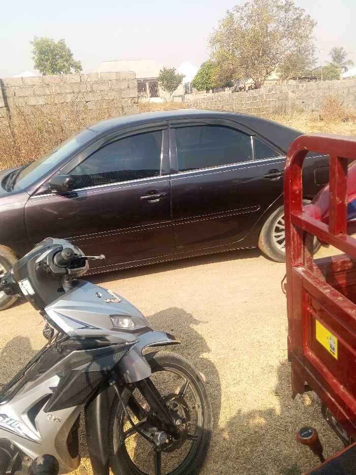 The scene in Adankolo, Nigeria, depicts an outdoor environment under bright daylight on an unpaved, light brown dirt surface. In the foreground, a silver and black TVS motor scooter is visible on the left, with its handlebars, front wheel, and a decorative string of white beads. To the right, part of a red three-wheeled commercial tricycle's cargo bed frame is visible, along with a yellow sticker and a brown gear shifter knob. In the midground, a dark purple sedan, identified as a Toyota Camry, is parked on the dirt, facing left. It features tinted windows, rain visors, chrome trim, and light-colored multi-spoke alloy wheels. The background consists of a low, light-colored concrete block wall. Behind the wall, several single-story residential buildings with light roofs and sparse vegetation, including trees with minimal foliage, are visible under a hazy sky. No individuals are present.