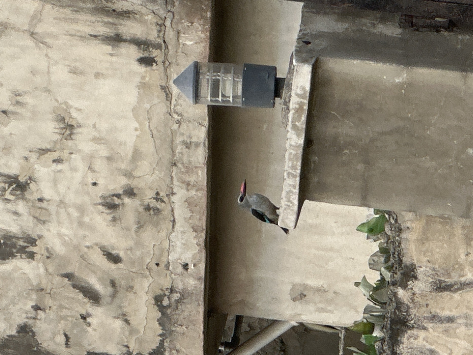 An adult Grey-headed Kingfisher (Halcyon leucocephala) with a grey head, pale underparts, and a prominent red beak with a black tip is perched left-of-center on a weathered concrete ledge. To the bird's right, a dark grey outdoor light fixture with a pointed top and ribbed, translucent housing is mounted on a separate concrete pillar. Below the bird, a lower concrete wall is topped with jagged, broken green and clear glass shards embedded in mortar, serving as a security measure. The background comprises a large, weathered light grey concrete wall exhibiting dark moisture stains and linear cracks. A segment of a light-colored pipe is visible in the upper left. The scene is illuminated by ambient daylight, depicting an outdoor urban environment in Ikorodu, Nigeria.
