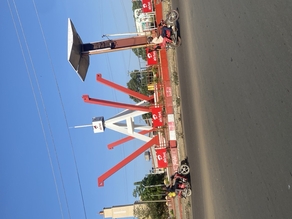 The image displays a clear blue sky over a public roadway and monument in Barnawa, Nigeria. Central to the scene is a large landmark comprising architectural letters, primarily red and white. A prominent red 'W' is visible, alongside a white 'A' topped with an "airtel" branded cuboid structure and a slender spire. Additional red structural elements suggest further letters. This monument is situated within an island or roundabout, delineated by a low red and white striped curb and multiple red billboards featuring the white "airtel" logo. To the far left, a tall, light-colored minaret structure is visible behind the monument. To the monument's right, a dark, vertical support structure with a flat, light-colored canopy extends upwards. Overhead, several power lines are visible. The asphalt road in the foreground is occupied by two motorcycles, both traveling from right to left. The motorcycle on the left is red, carrying a driver in a dark shirt and pants, and a passenger (identified by smaller size) wearing a yellow top. The second motorcycle, positioned further right, is silver/grey and carries a driver in a light-colored shirt and dark pants, and a passenger in patterned pants and a dark top. No other significant human activity or vehicles are immediately apparent.