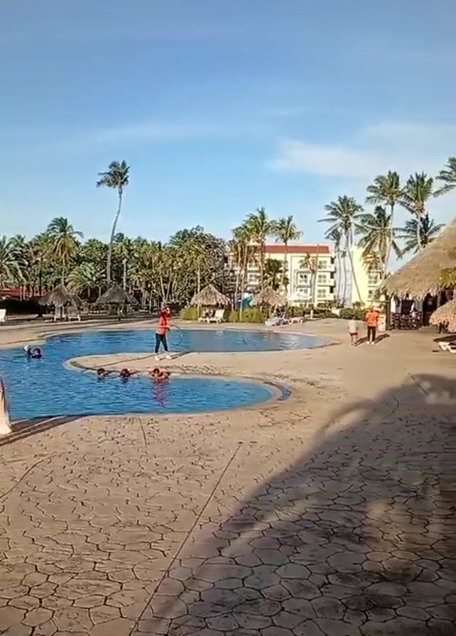 n outdoor pool area at a resort or hotel, with a winding blue pool, surrounded by a stone-paved area. Several people are in the pool and others are around the pool area. There are several staff members, all wearing bright orange shirts, visible. A man in an orange shirt is holding a hula hoop and appears to be engaging with someone. There are palm trees and thatched umbrellas around the pool area, with a multistory white building in the background. The sky is clear and blue.