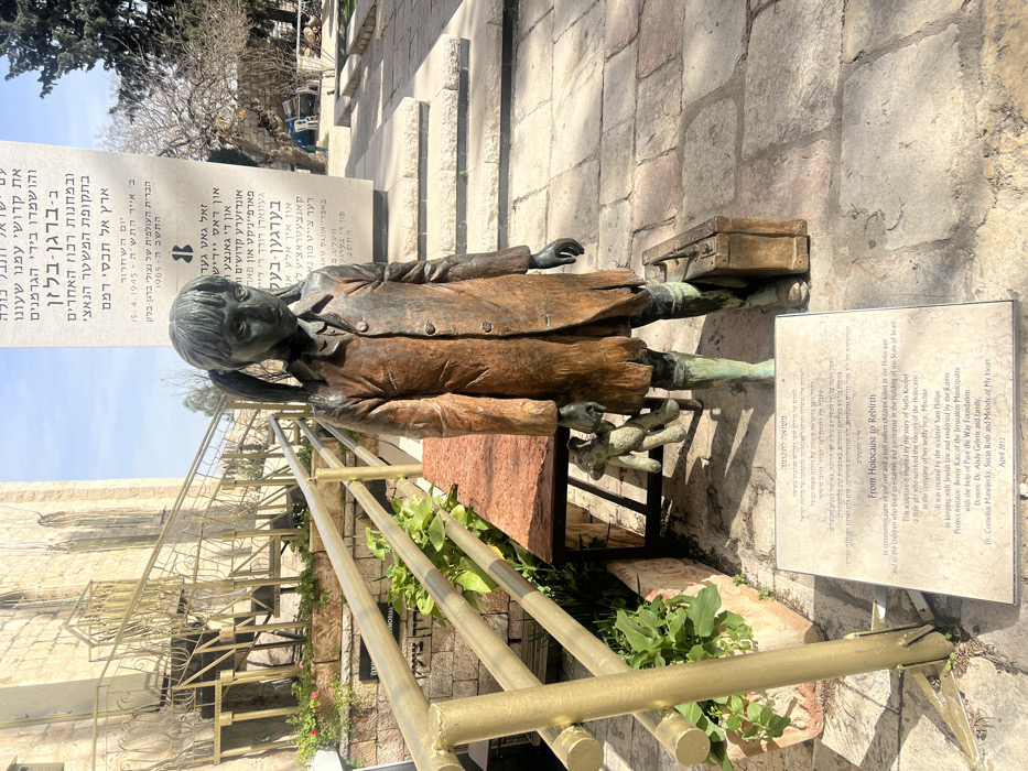 The image displays a bronze statue of a young girl standing outdoors, positioned slightly off-center to the right. The girl, depicted with pigtails and wearing a long coat and boots, holds a small teddy bear in her left hand, while a suitcase rests on the ground beside her right foot. Her face appears somber. Behind the statue and slightly to the right, a large, light-colored stone monument stands vertically, covered with extensive Hebrew text. Further back and to the left, a traditional Jerusalem stone building with arched windows and an ornate metal staircase is visible. A gold-colored metal railing runs horizontally across the left side of the foreground, bordering a planter box containing green foliage and a simple brown wooden bench. The ground is paved with irregular stone slabs. In front of the statue, a rectangular plaque is embedded in the pavement. It features text in both Hebrew and English, identifying the sculpture as "From Holocaust to Rebirth," commemorating child victims and survivors of the Holocaust, and inspired by the story of Stella Knoebel and her teddy bear, Mushke. The plaque is dated April 2012. The scene is located at the Yad Vashem Holocaust Memorial in Jerusalem, Israel, within an outdoor memorial area. The lighting suggests a bright, clear day.