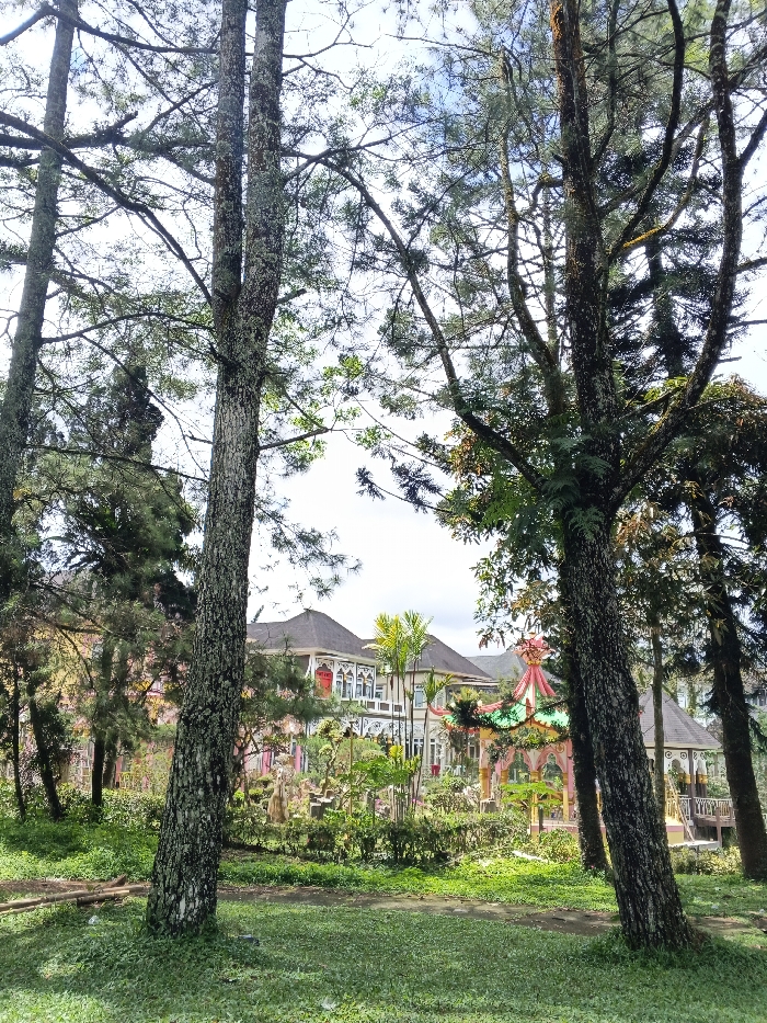 A colorful building is partially visible through a grove of trees. The building has red, white, and other hues, with multiple windows and architectural details. In front of the building is a vibrant pagoda-like structure with green, pink, and yellow colors. The foreground consists of a grassy area dotted with trees that frame the scene. The sky is overcast, giving a soft, natural light to the overall image.