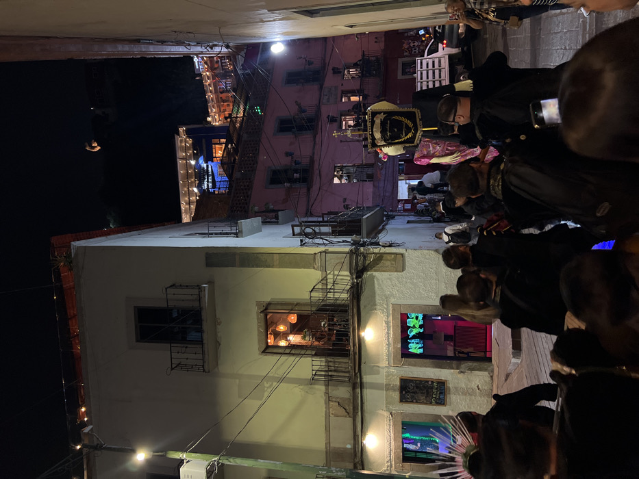 The image captures a nighttime street scene within a narrow callejón in Guanajuato City, Mexico