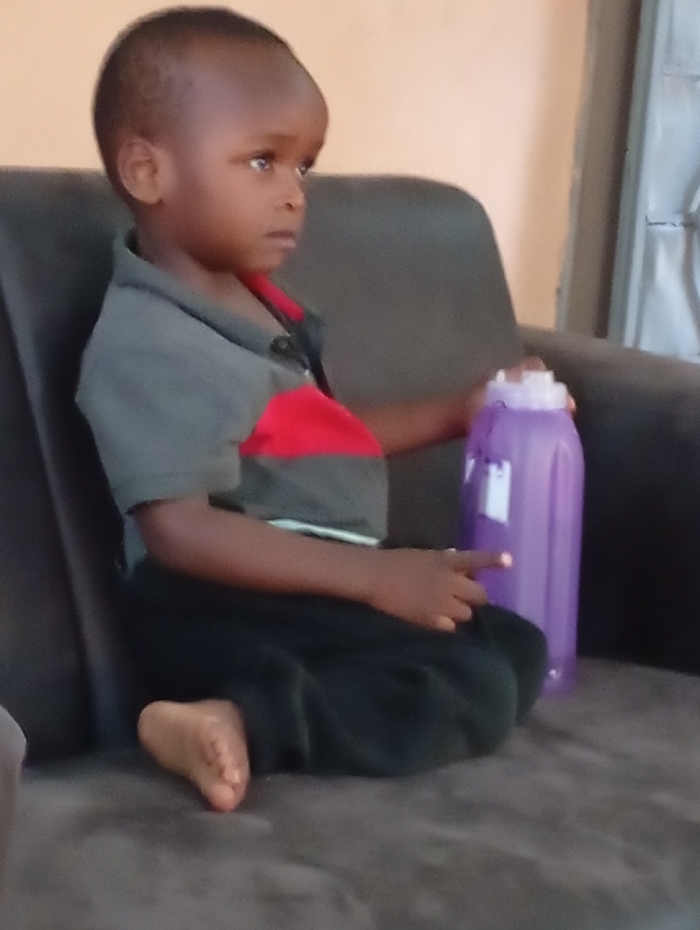 A small boy with dark skin sits on a gray sofa. He wears a gray and red collared shirt and dark pants. His bare foot is visible on the sofa cushion. The boy is holding a tall, purple water bottle with a white lid in his left hand. He is looking off to the side with a serious expression. A tan wall is behind the sofa, and a partially visible window is in the background.