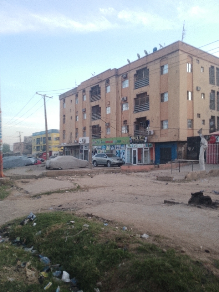A four-story building with satellite dishes on top stands beside a street. Ground-level shops line the building’s front. Cars covered with tarps are parked nearby, along with an uncovered silver SUV. The unpaved street is rough, with patches of grass and litter in the foreground. Utility poles with wires cross the sky.
