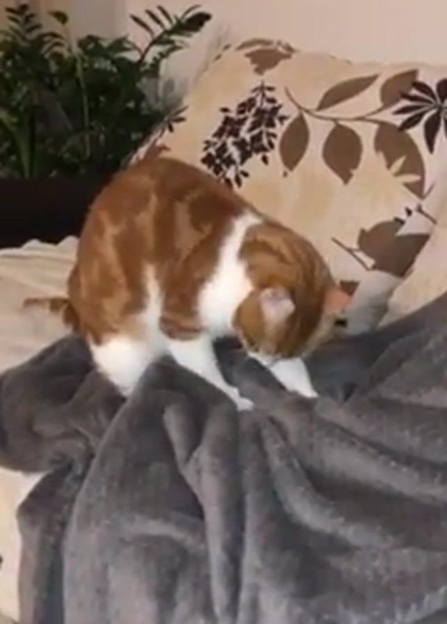 An orange and white cat is standing on a gray blanket atop a bed, sniffing and appearing to dig into the blanket with its front paws. A patterned pillow rests behind the cat, and a potted plant is visible in the background. A voice speaks in the background, addressing someone, but the speaker is not visible.