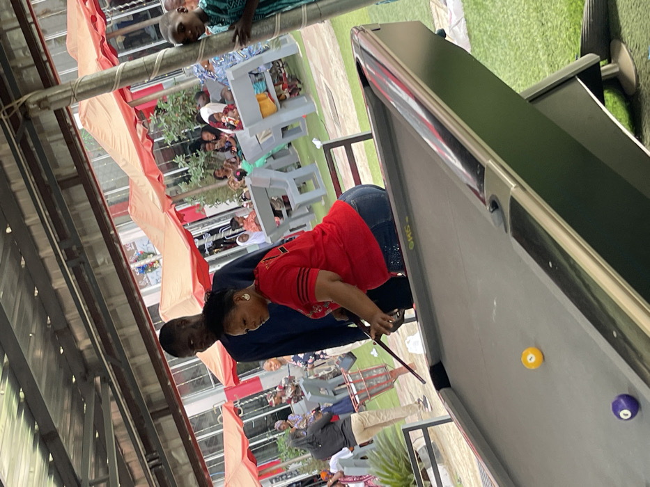 People gather under a decorated awning. A woman wearing a red shirt and blue jeans is playing pool with a man next to her. A yellow and a purple pool ball are on the gray pool table. Additional people are sitting at gray tables in the background. A child is hanging from the awning structure.