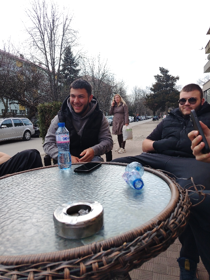 The image displays an outdoor urban scene in Targovishte, Bulgaria, under an overcast sky. In the foreground, a round glass-topped table with a wicker-like edge is present. Objects on the table include a blue plastic bottle of DEVI water, a black smartphone positioned face down, a metallic ashtray containing cigarette butts, and a crumpled blue plastic bottle. Three individuals are present. On the far left, a person's leg, clad in black pants, is partially visible. Seated at the table on the left, a young adult male with short dark hair and stubble wears a grey hooded sweatshirt under a black puffer vest. He is smiling towards the left side of the image frame. Seated at the table on the right, a second young adult male with dark hair, a beard, and sunglasses wears a black puffer jacket. He holds a black smartphone in his right hand. In the mid-ground, an adult female with light hair, wearing a long brown coat and light shoes, walks on a paved sidewalk from right to left. She holds a white plastic bag in her left hand and a phone to her right ear. The background features a street with several parked vehicles, including a silver station wagon. Numerous bare deciduous trees and a few evergreen trees line the street. Multi-story buildings are visible behind the foliage, and the sky is light and overcast.