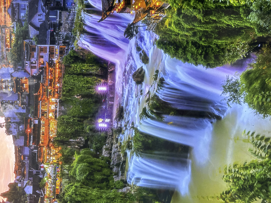 - "The image displays a nighttime view of Furong Ancient Town, China, centered around its prominent multi-tiered waterfall" by FM-7eaFY2, licensed under CC BY 4.0
