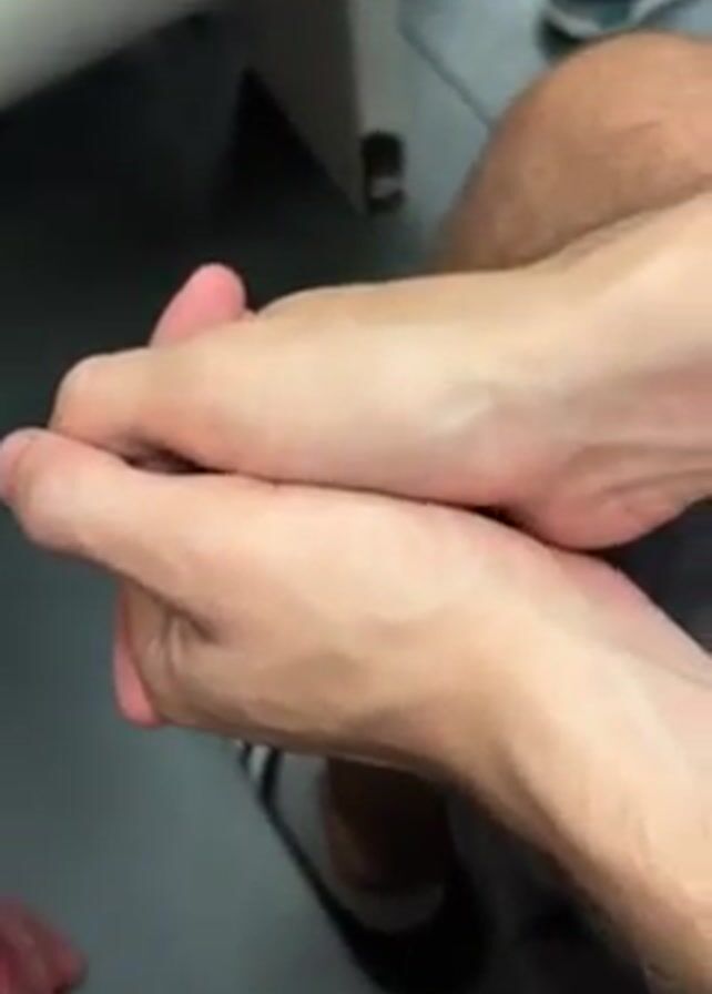 A close-up shows an individual sitting down, wearing black and white Adidas slides. They are holding their own hand, manipulating their fingers and palm, as if examining or stretching them. Another person's feet are visible in the background, wearing sneakers. The scene appears to be indoors.