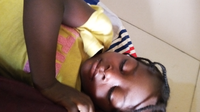 An individual with dark skin, appearing to be a child or young adult, is depicted at rest or asleep. The subject's eyes are closed, and the mouth is slightly open. Dark hair is styled in braids. The individual is wearing a yellow shirt, which appears to have a faded pink graphic on the chest. They are positioned on a surface that includes a striped fabric (blue, white, and red) and a solid yellow fabric. A dark reddish-brown fabric is partially visible in the lower left of the frame. The background consists of light-colored tiled flooring with dark grout lines, indicating an indoor setting. The specific location within the city of Unknown, Unknown is indeterminate from the image.