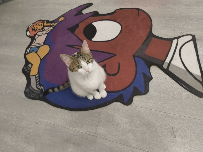 - "A domestic short-haired cat with white fur and brown/gray tabby markings on its head and tail sits centrally on a stylized, irregularly shaped rug in an indoor setting in Sofia, Bulgaria" by FM-JKINn1, licensed under CC BY 4.0