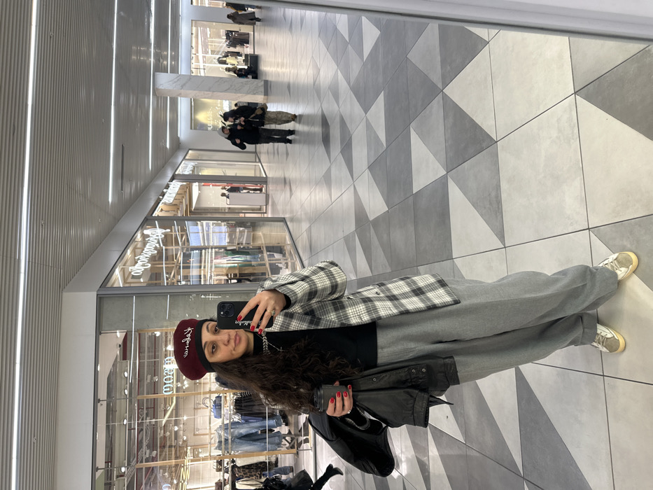 The scene is an interior view of the East Point Shopping Mall in Tbilisi, Georgia. A woman, positioned centrally, is captured in a mirror selfie, holding a black smartphone. She has long, dark, curly hair and is attired in a dark red beret with white script, a black long-sleeved top, a grey and white plaid double-breasted blazer, loose-fitting light grey trousers, and distressed off-white sneakers. She wears a silver chain with a cross pendant and red nail polish. In her left hand, she holds a black insulated coffee cup and a folded black jacket. The immediate background to the left features a glass storefront displaying various clothing items, including denim jeans and jackets on racks. Partially visible on the far left are the lower legs of a person wearing black boots, suggesting movement. The background to the right and center shows a brightly lit, expansive mall corridor lined with multiple retail storefronts, some with glass facades. A prominent store sign for "PULL&BEAR" is visible further down the corridor. In the mid-ground, two individuals are walking away from the camera: one wearing a dark jacket and a light beanie, and the other in camouflage-patterned pants and a dark top. Additional indistinct figures are present deeper within the mall corridor. The flooring throughout the mall features a distinct geometric pattern of alternating light grey and dark grey triangular tiles. The ceiling is white, equipped with multiple parallel linear fluorescent light fixtures.