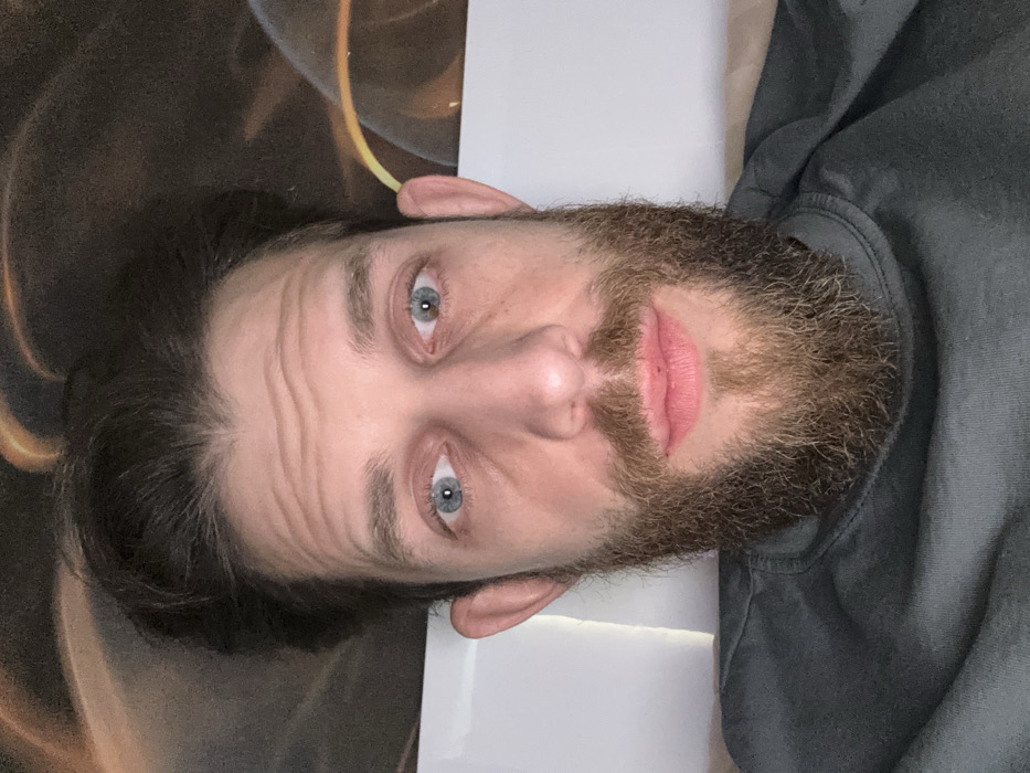 A light-skinned man with a beard and blue eyes is shown from the chest up. The man is wearing a dark-colored crewneck sweatshirt. The background includes a white surface and what appears to be a decorative wall with brown and gold swirls. The man is looking directly at the camera with a slight expression. The image is rotated, placing the man's left side towards the top of the frame.