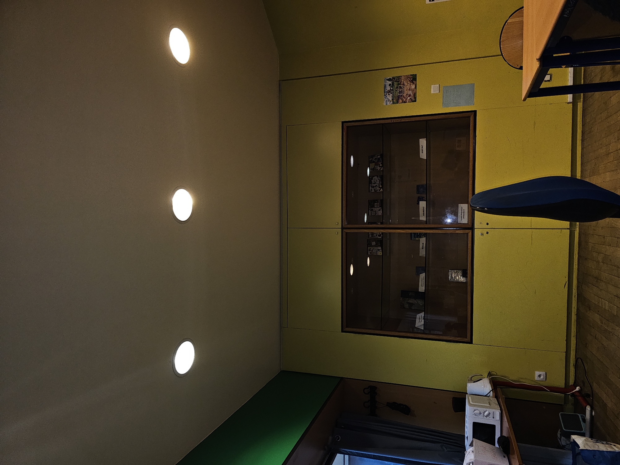 The image is an interior shot of a room with a cream-colored ceiling featuring three recessed circular lights. The walls are a muted yellow. Two glass-fronted display cases are inset into the wall, each appearing to contain photographs and documents. Above the display cases are a few images, including what looks like a group photograph. To the right, part of a wooden table with blue legs and a blue chair are visible. The floor appears to be made of wood planks. A small table with electronic devices is on the right. The bottom of the frame reveals a green surface and what appears to be a window with a curtain. The location cannot be determined from the image.