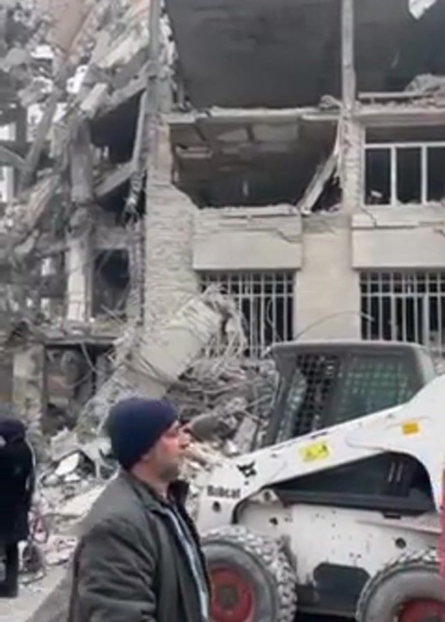 remains of a collapsed building, likely due to an earthquake or explosion. The structure is heavily damaged, with concrete and metal debris strewn around. Several people are present at the scene, including emergency responders in red uniforms, and individuals in casual attire. A small Bobcat vehicle is positioned near the rubble. The sky is overcast. The overall atmosphere suggests a disaster relief and recovery operation.