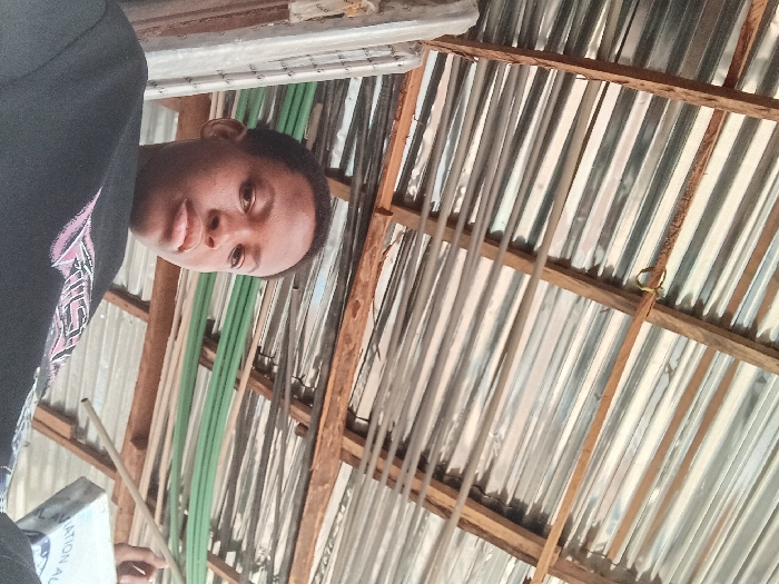 A person with dark hair and skin, wearing a dark shirt, is partially visible on the left. The background features numerous metal pipes, some painted green, stacked against a wooden frame. Corrugated metal sheets form a roof above, supported by a wooden structure. The image is rotated.